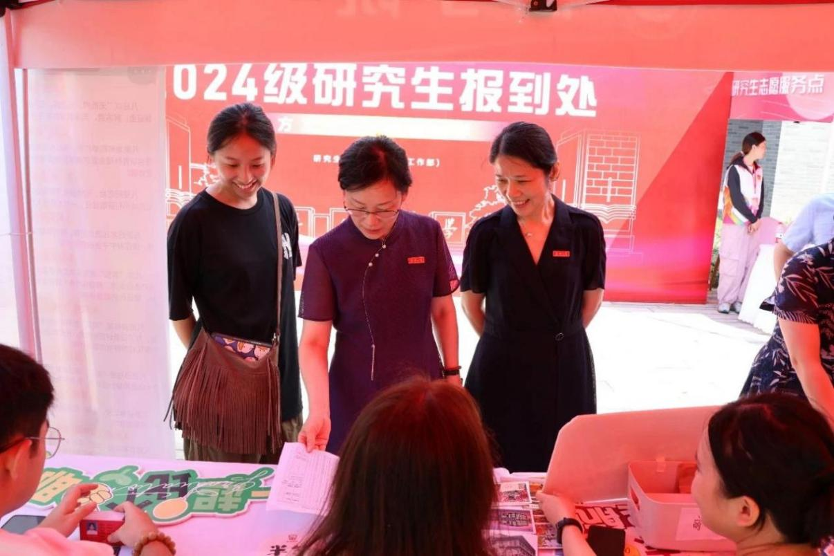2024级35位硕士研究生顺利报到,学校研究生处和学院为新生报到做好了充分的准备,副校长张琦、副校长於建明以及研究生处负责人到报到点慰问新同学,并走访寝室。