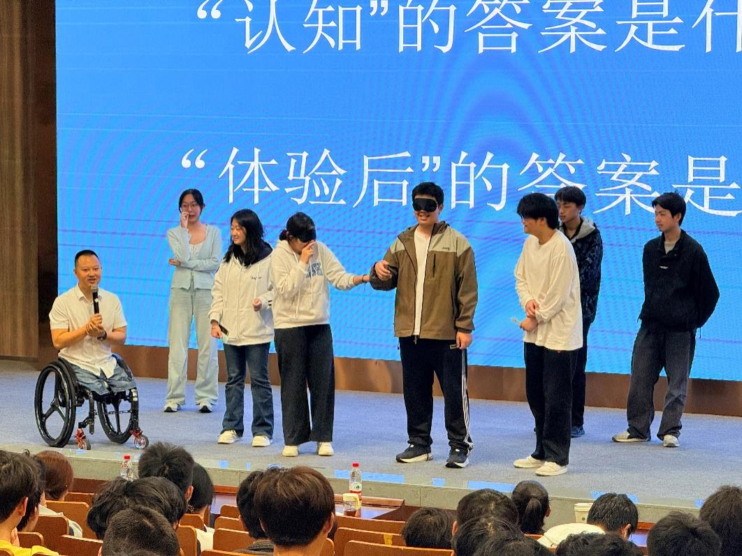 在互动环节,代国宏老师邀请现场同学亲身参与“无手刷牙”“蒙眼行走”“轮椅行动”等活动。在模拟残障状态的过程中,同学们真切感受到了日常生活中的种种不便与艰辛,也更加深刻地理解代老师多年来克服困难、奋勇前行的不易。体验结束后,多位同学分享了自身感受。有同学表示“仅仅体验了几分钟,我就感到寸步难行,而代老师却用这样的身体活了十几年、拼了十几年。我还有什么理由抱怨生活?”还有同学表示:“这次活动让我第一次认真思考:如果我也遭遇不幸,我能否像他一样站起来?答案是不确定,但代老师的故事给了我勇