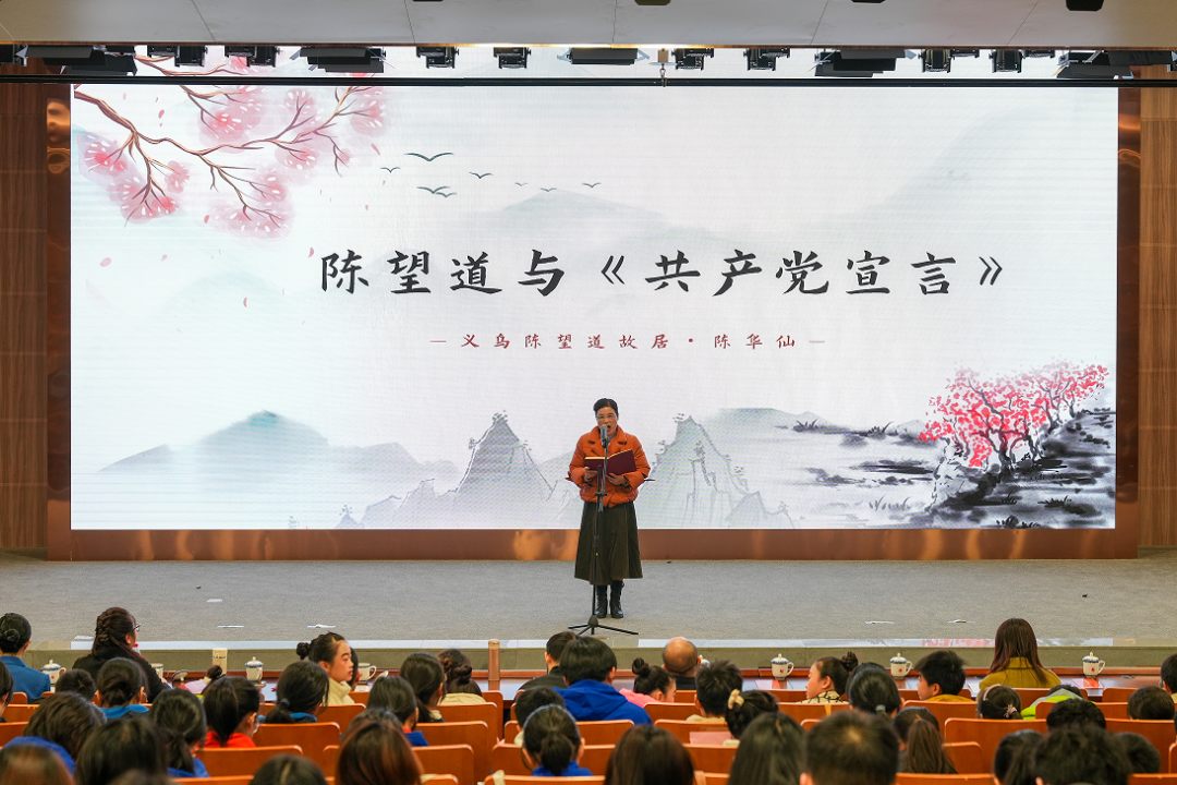 陈望道故居讲解员、陈望道先生的侄孙女陈华仙讲授了题为《陈望道与<共产党宣言>》的思政课。她以独特的家族视角和深厚的情感,生动描绘了陈望道先生的家世背景,展现了陈望道先生心怀家国、情系苍生的博大情怀,以及他在翻译《共产党宣言》过程中的艰辛与执着。
