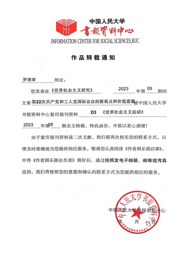 罗理章教授发表在《世界社会主义研究》2023年第5期的论文《第22次共产党和工人党国际会议的新观点和价值意蕴》被中国人民大学书报资料中心复印报刊资料《世界社会主义运动》2023年第5期全文转载。
