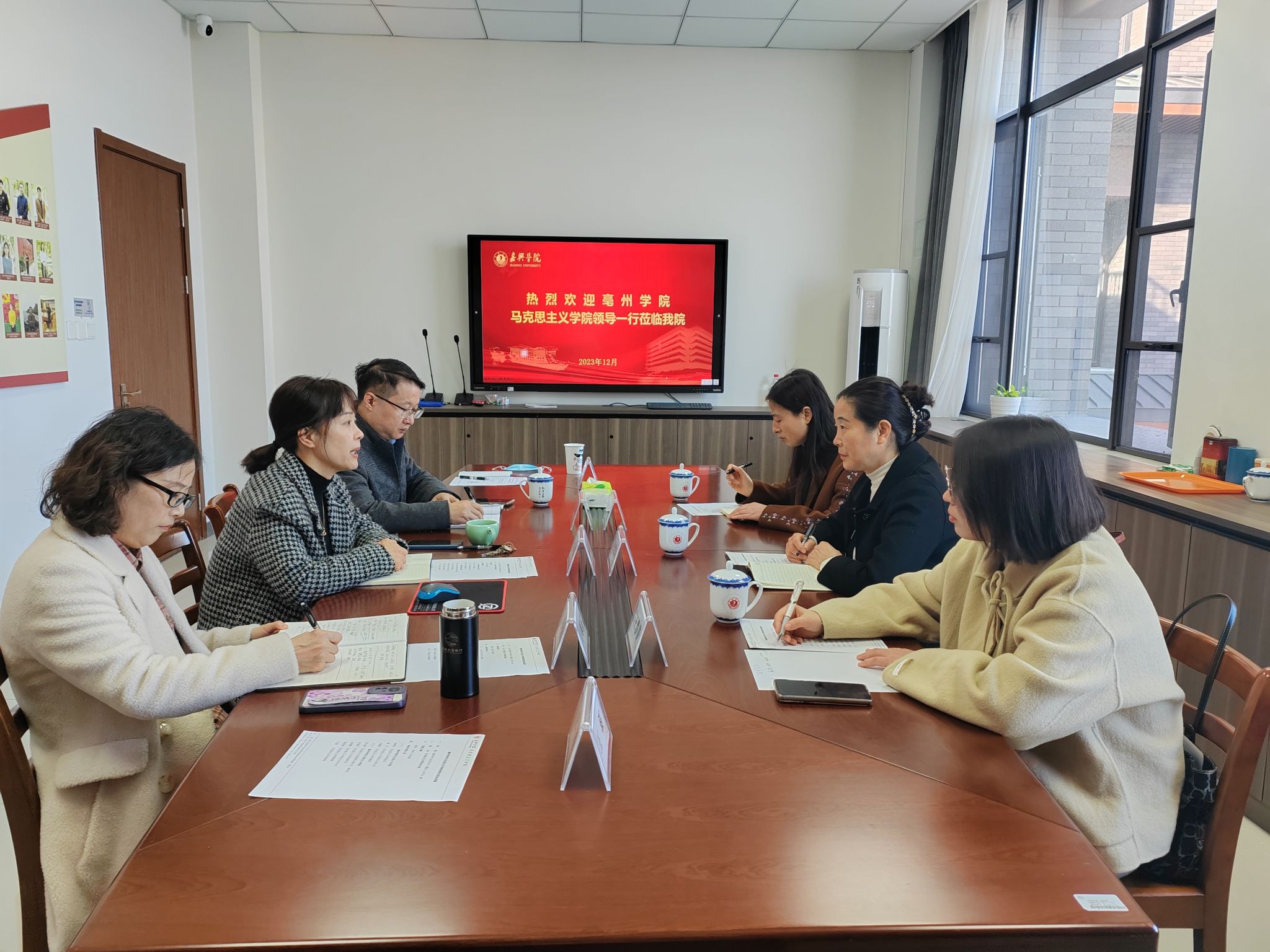 128午,亳州学院马克思主义学院院长张慧芳一行3人到色情动漫 交流座谈。色情动漫 书记宋之霞、副院长许惠芬、办公室主任余珊珊及部分专任教师参加了座谈。