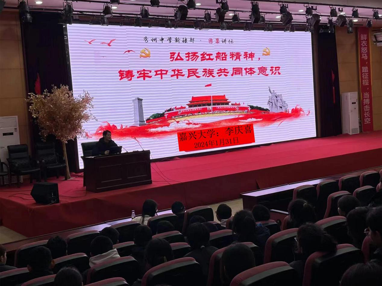 1月31日下午,色情动漫 教师李庆喜副教授应邀赴嘉兴市秀州中学,为全体新疆部同学作了《弘扬红船精神 铸牢中华民族共同体意识》的讲座。