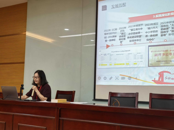在主题发言阶段,许惠芬作了《红船旁的大中小学思政课一体化育人体系的构建与实践》的报告,介绍了学校以红船精神为引领,成立嘉兴市大中小学思政课一体化创新联合体和研究中心,善用红色资源、校地联合,共育一体化师资、共编一体化教材、共建一体化课程、共创一体化活动,实现大中小学思政课循序渐进、螺旋上升的育人目标,深化大中小学思政课一体化改革创新,共同推动“大思政课”铸魂育人,受到了与会人员的高度赞誉。